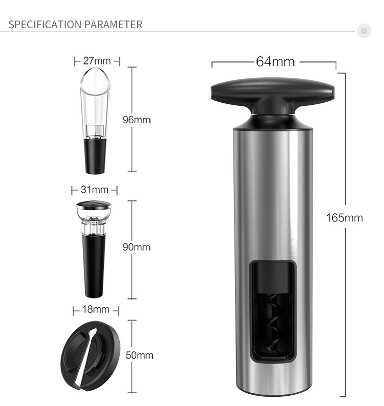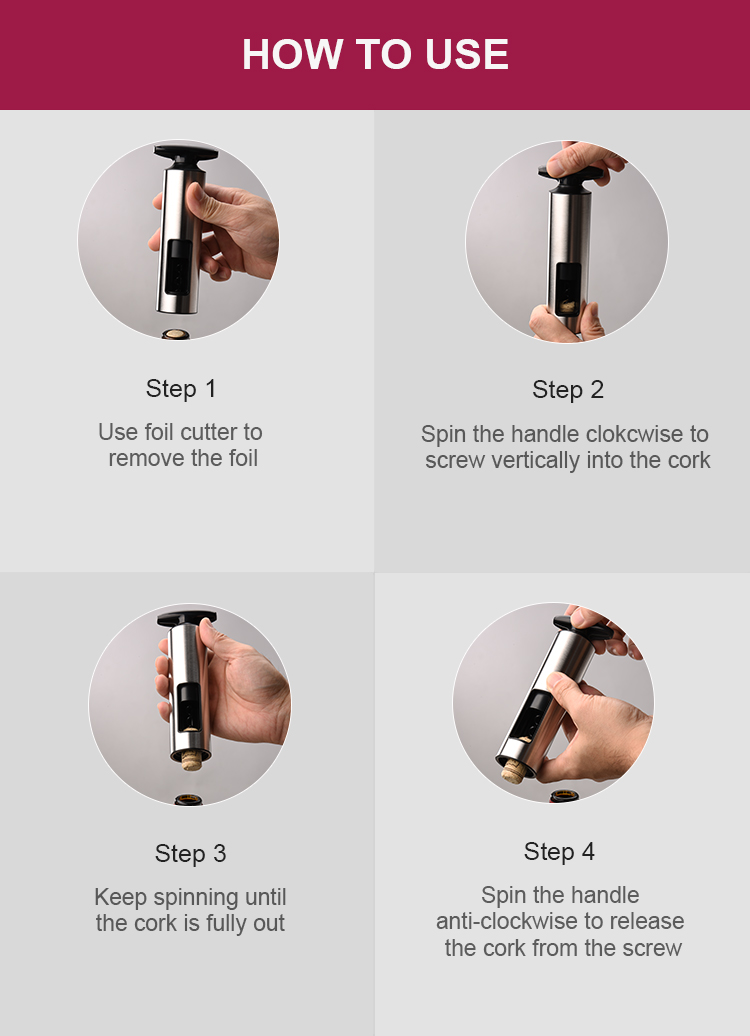 Package Included | * 1 x Corkscrew * 1 x Foil Cutter * 1 x Wine Pourer * 1 x Vacuum Wine Stopper * 1 x Instruction Manual * 1 x Gift Box |